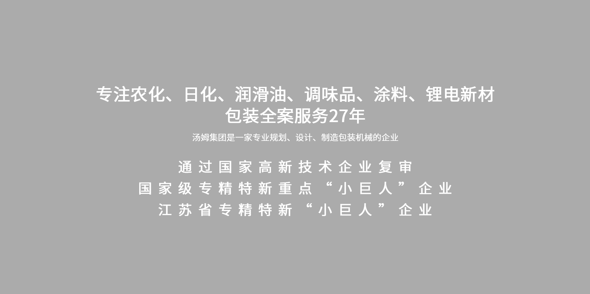 江蘇湯姆集團在液態、粉體、固體、顆粒等包裝領域的專長保證了工藝設計與整線工程的完美結合。建立了農化、石化、調味品、日化、涂料等不同包裝領域的工藝設計體系,根據不同的包裝形式及具體的工廠布局,均可提供專為您項目而量身定制的交鑰匙解決方案 。